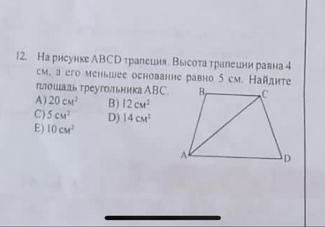 на рисунке авсд трапеция высота трапеции равна 4 а его меньшее основание 5 найдите площаь треугольника авс
