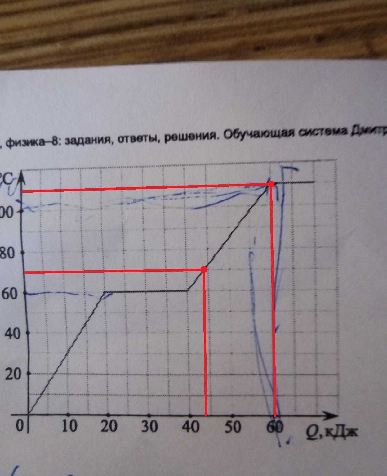 Рассматриваем график на фото. Проводим прямую от t₂ = 100 °C к графику зависимости, а после - к оси абсцисс, чтобы узнать значение Q: Q₂ = 60 кДж - это окончательное значение. Теперь находим Q при t₁ = 70 °C: Q₁ ≈ 44 кДж.