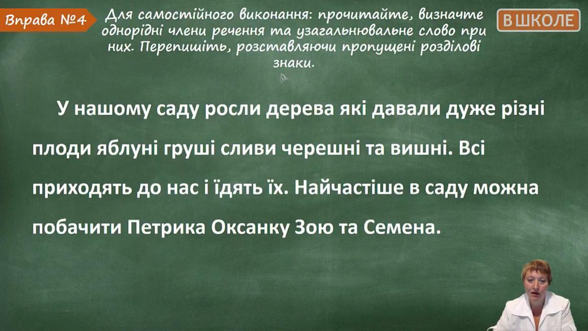 1. У нашому саду росли дерева, які давали дуже різні плоди: яблуні, груші, сливи, черешні та вишні. (узагальнювальне слово - плоди, а однорідні члени речення - яблуні, груші, сливи, черешні, вишні)