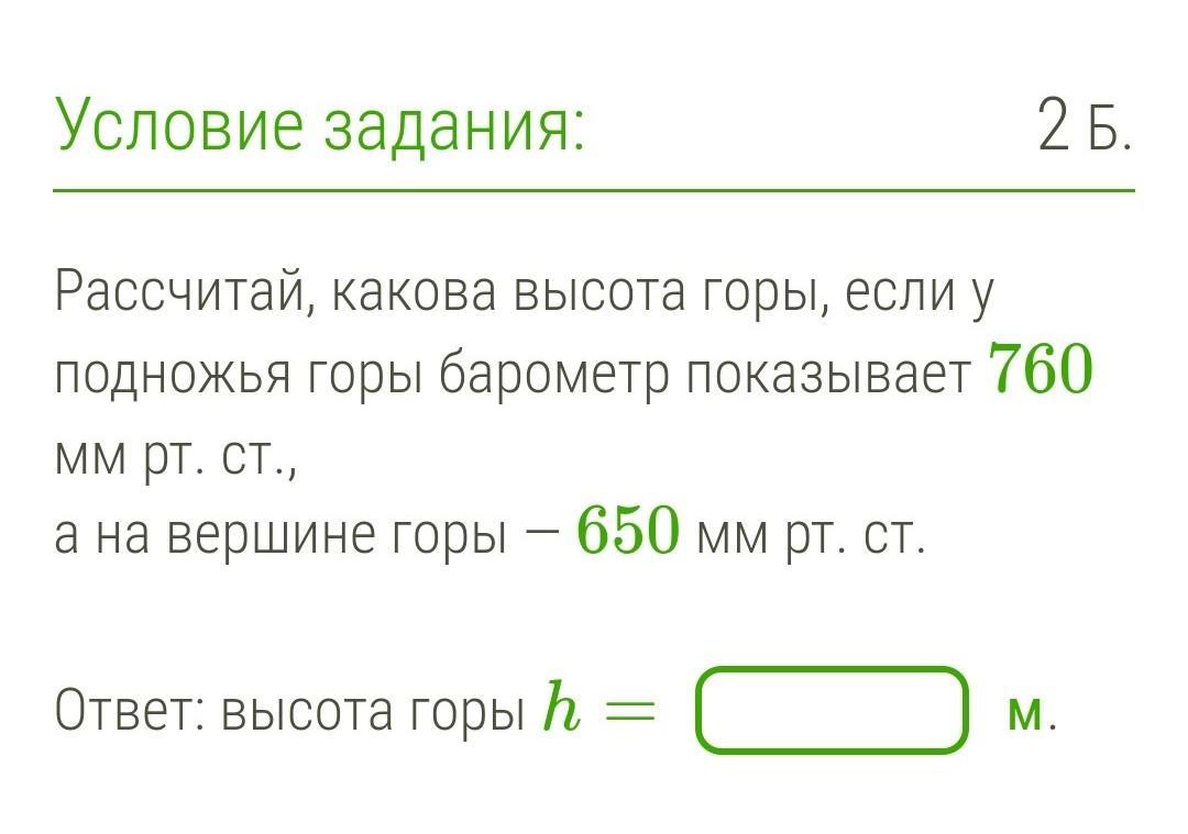 Рассчитай, какова высота горы, если у подножья горы барометр показывает 760 мм рт. ст.,