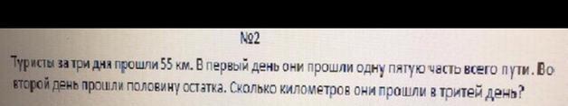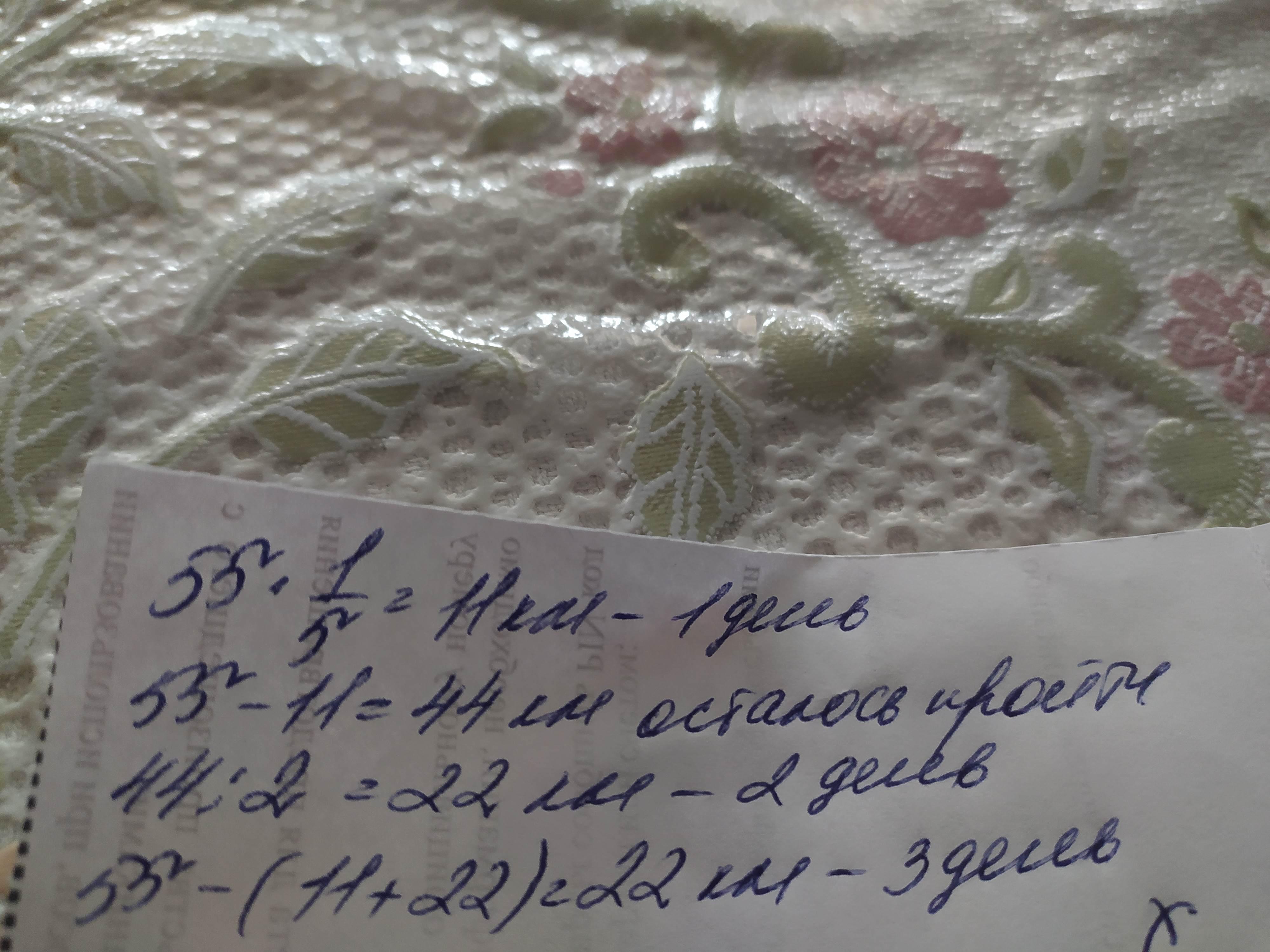 в первый день 1/5 з 55 км. это 20%. пусть х - путь который они прошли з первый день. отношение в виде хреста