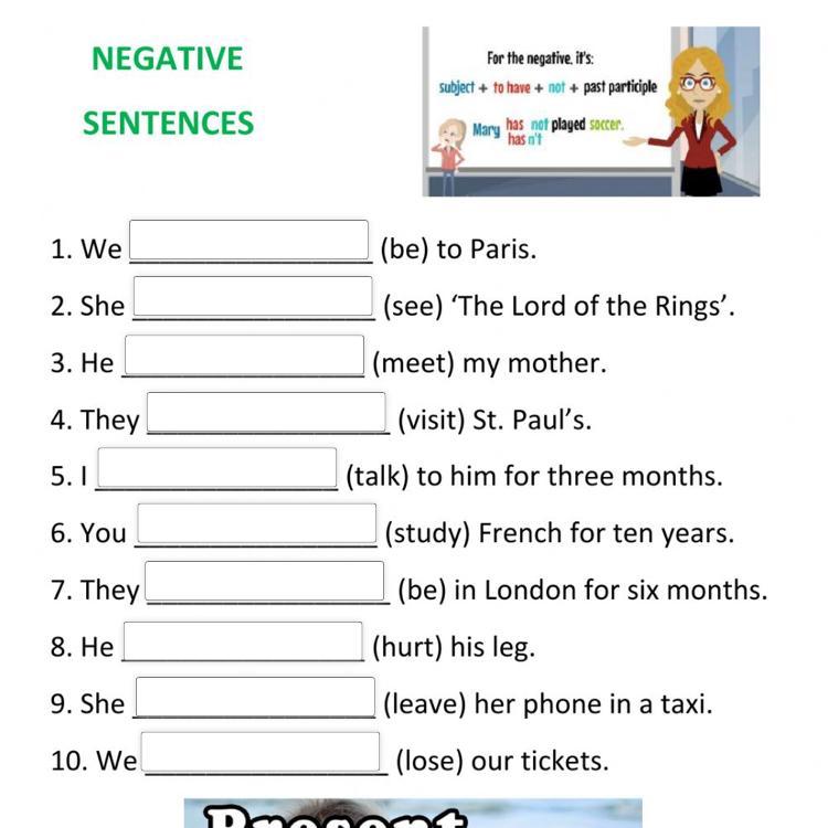 1 havent been 2 hasnt seen 3 hasnt met 4 havent visited 5 havent talked 6 havent studied 7 havent been 8 hasnt hurt 9 hasnt left 10 havent lost