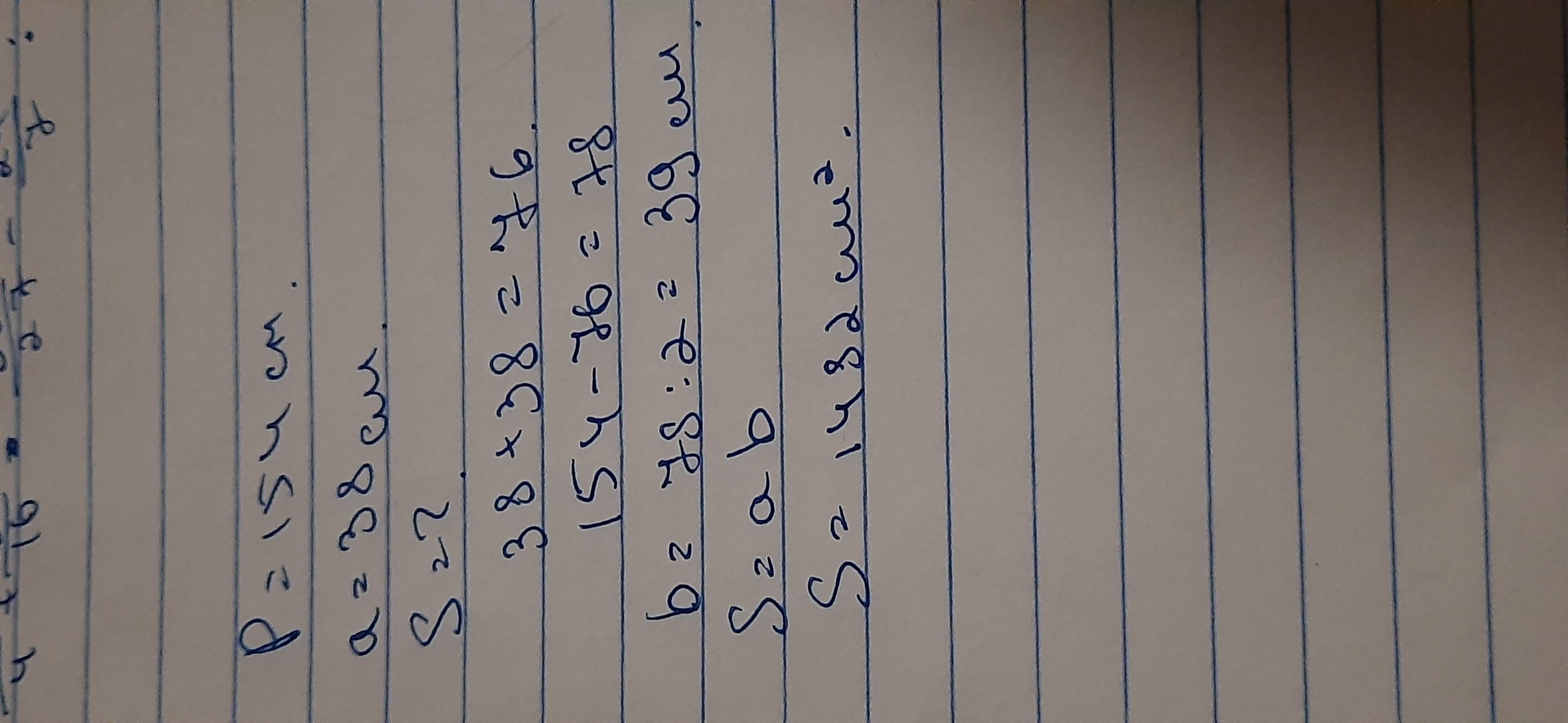 38×2=76(см), 154-76=78(см), 78:2=39(см)-вторая сторона, S=39×38=1482(cм²)