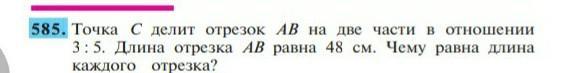 Пошаговое объяснение: определяем сколько всего частей имеет отрезок: 3+5=8. Определяем сколько см приходится на одну часть: 48/8=6см. Определяем длину каждого отрезка: 6*3=18см; 6*5=30см.