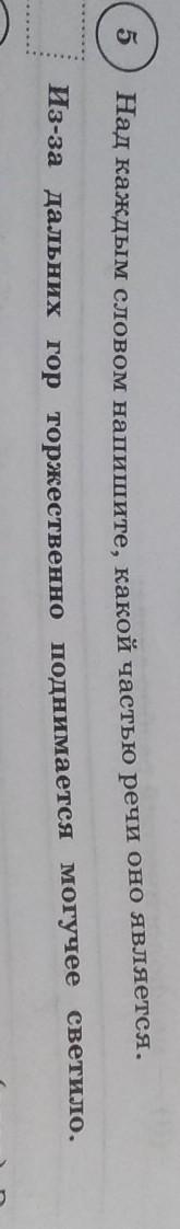 Из-за(предлог) дальних(прилаг) гор(сущ) поднимается(глагол) могучее(прилаг) светило(сущ).