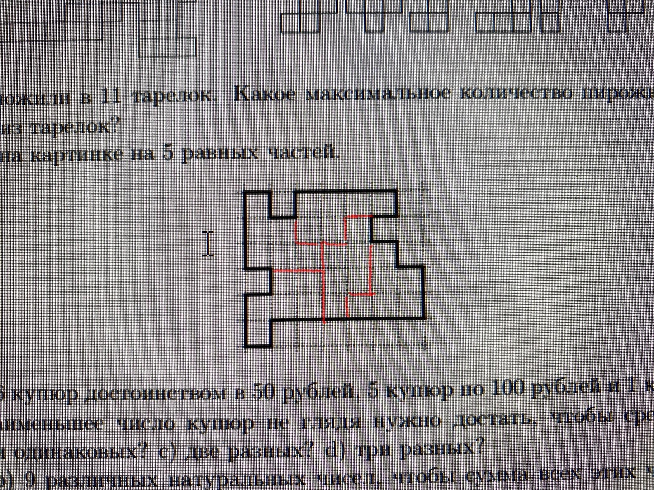 Ответ: Если обратить внимание, то там можно увидеть по пять равным частей по 4, 3, 2 и 6 где пониже и прлучается что фигура разделена по 5 равных частей
