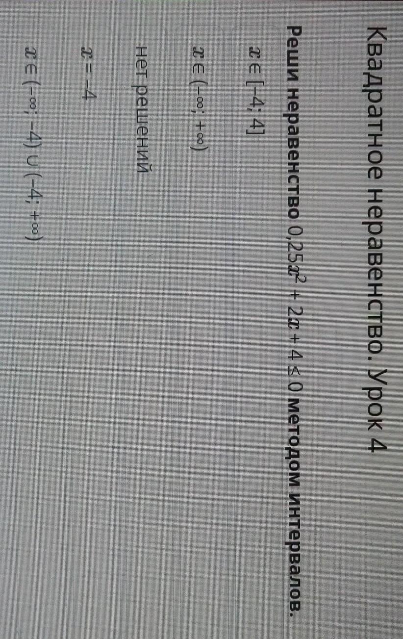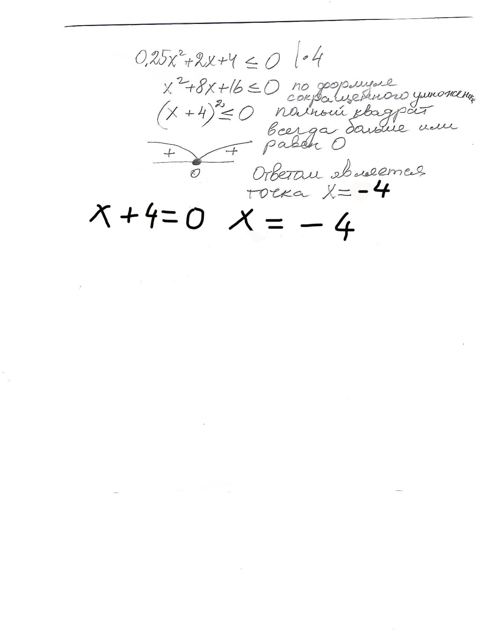 Реши неравенство 0.25x ^2+2x+4больше или ровно 0 методом интервалом