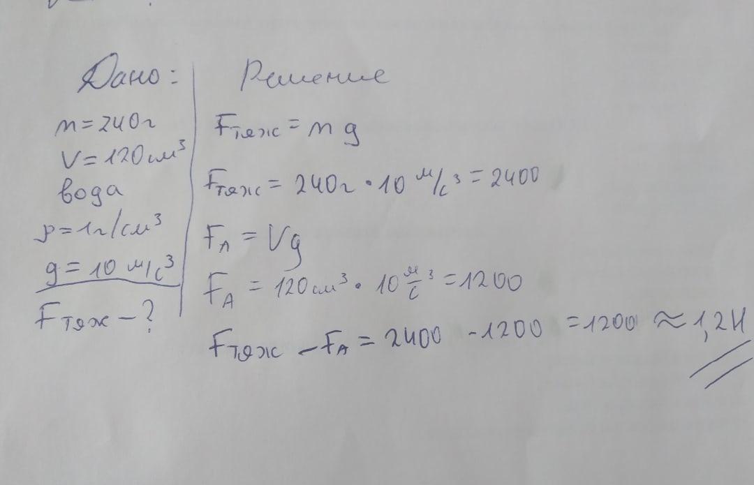 Маша на тонкой лёгкой нити удерживает целиком погружённый в воду пластмассовый брусок массой м=240г и объём V= 120см³ так что он не касается дна. Определите силу натяжения нити считая плотность воды равной Рводы=1г/см³. Ускорение свободного падения g=10м/с³
