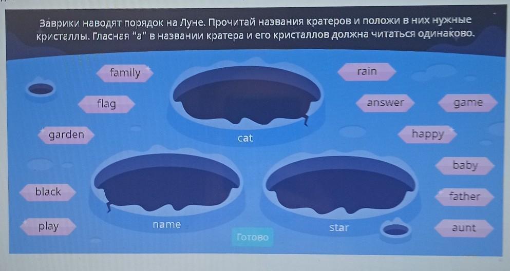 заврики наводит порядок на Луне Прочитай названия кратеров и положи в них нужные кристаллы гласная А в названии кратера и его Кристалл должна читаться одинаково