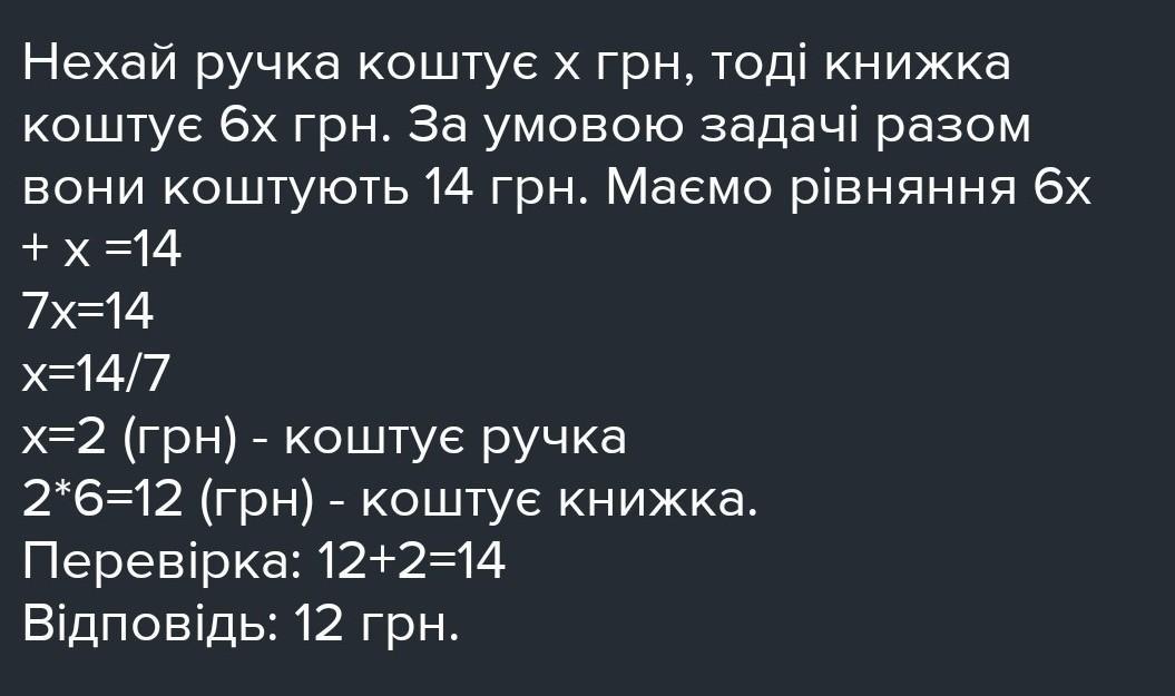 Книжка і ручка разом коштують 14 грн, причому книжка коштує у 6 разів більше, ніж ручка. Скільки коштує книжка?
