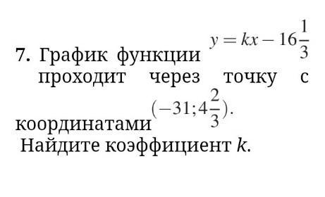 График функции у= кх - 16 1/3 проходит через точку с координатами (-31; 4 2/3) Найдите коэффициент k.