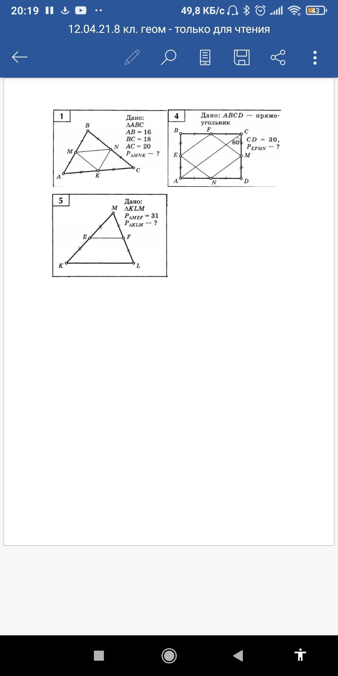 Так как EF - средняя линия треугольника, то он соответственно делит стороны этого треугольника пополам. А если он делит их пополам, значит делает в два раза меньше. Если стороны в два раза меньше, значит и периметр (так же будет с площадью) будет в два раза меньше. Если бы нам сказали найти периметр меньшего треугольника, а дали бы нам периметр большего - мы бы просто разделили периметр большего треугольника на 2. А тут наоборот.