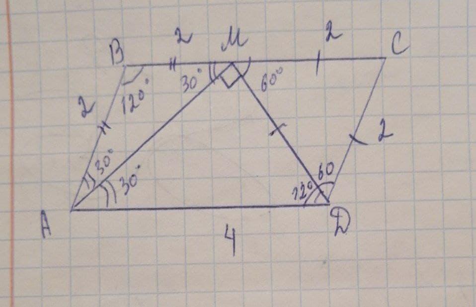 CРОЧНО ДАЮ 60 БАЛЛОВ. И ДАЙТЕ ЧЕРТЕЖ В параллелограмме ABCD биссектриса угла A равного 60°пересекает сторону BC в точке M отрезки AM и DM перпендикулярны. найдите периметр параллелограмма если ab = 2