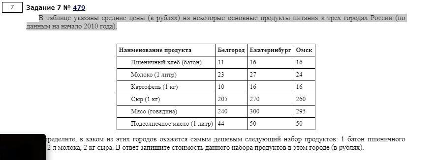 Определите, в каком из этих городов окажется самым дешевым следующий набор продуктов: 1 батон пшеничного хлеба, 2 л молока, 2 кг сыра. В ответ запишите стоимость данного набора продуктов в этом городе (в рублях).