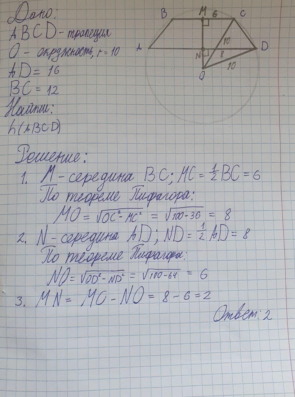 Основания равнобедренной трапеции равны 16 и 12. Радиус описанной
