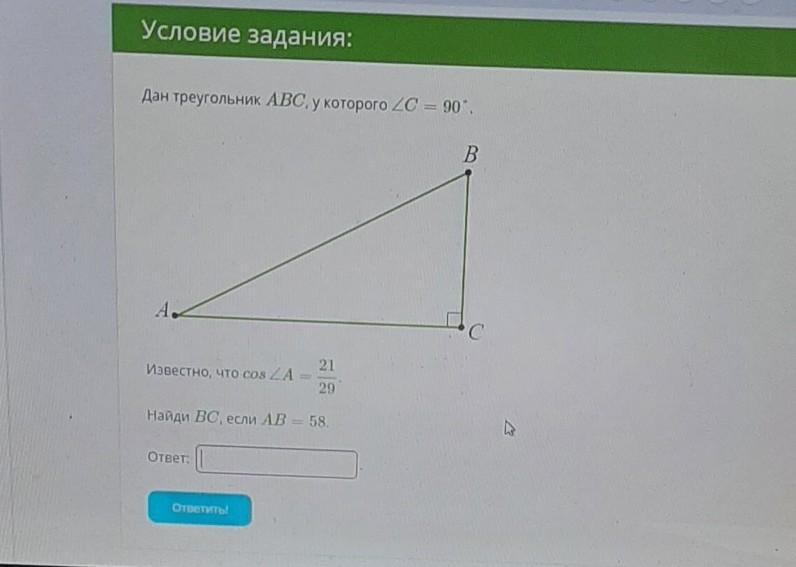 - Косинус угла — это отношение прилежащего катета к гипотенузе.