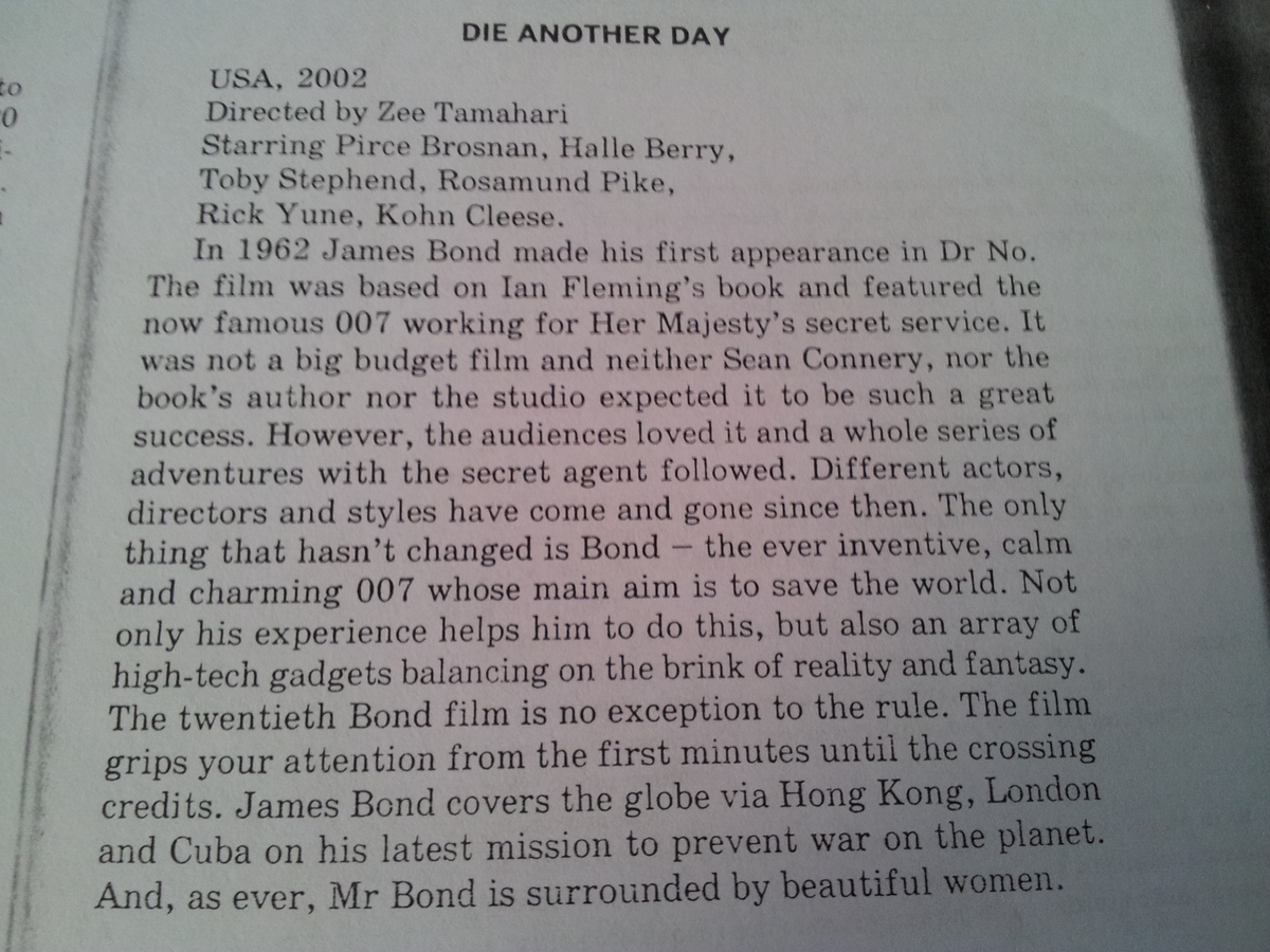 В 1962 Джеймс Бонд сделал свое первое появление в dr.no. Фильм основан на книге Яна Флеминга и показал ныне знаменитый 007 работает на секретной службе Ее Величества. Это был не большой бюджет и ни Шон Коннери , ни автор книги , ни студия ожидал, что будет такой большой успех. Однако зрители любили его и целый ряд приключений с секретным агентом последовало. Диффере актеры, режиссеры и стили приходят и уходят с тех пор. Единственное, что не изменилось, это Бонд -никогда изобретательны , спокойный и очаровательный 007 основной целью которой является , чтобы спасти мир . Не только его опыт помогает ему сделать это, но также множество высокотехнологичных гаджетов балансирует на грани реальности и фантазии . 12-я фильм о Бонде не является исключением из этого правила. Фильм захватывает ваше внимание с первых минут до перекрестка кредитов. Джеймс связь охватывает весь земной шар через Гонконг , Лондон и Кубы на его ATEST миссии , чтобы предотвратить войну на планете. И , как всегда, мистер Бонд окружен красивыми женщинами.