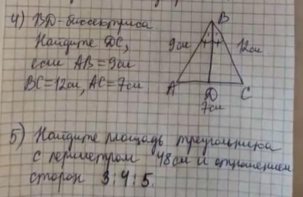 4). Т. к. биссектриса треугольника делит его сторону на отрезки, пропорциональные сторонам, то АВ/AD=BC/DC. пусть DС=х, тогда АD=7-х.
