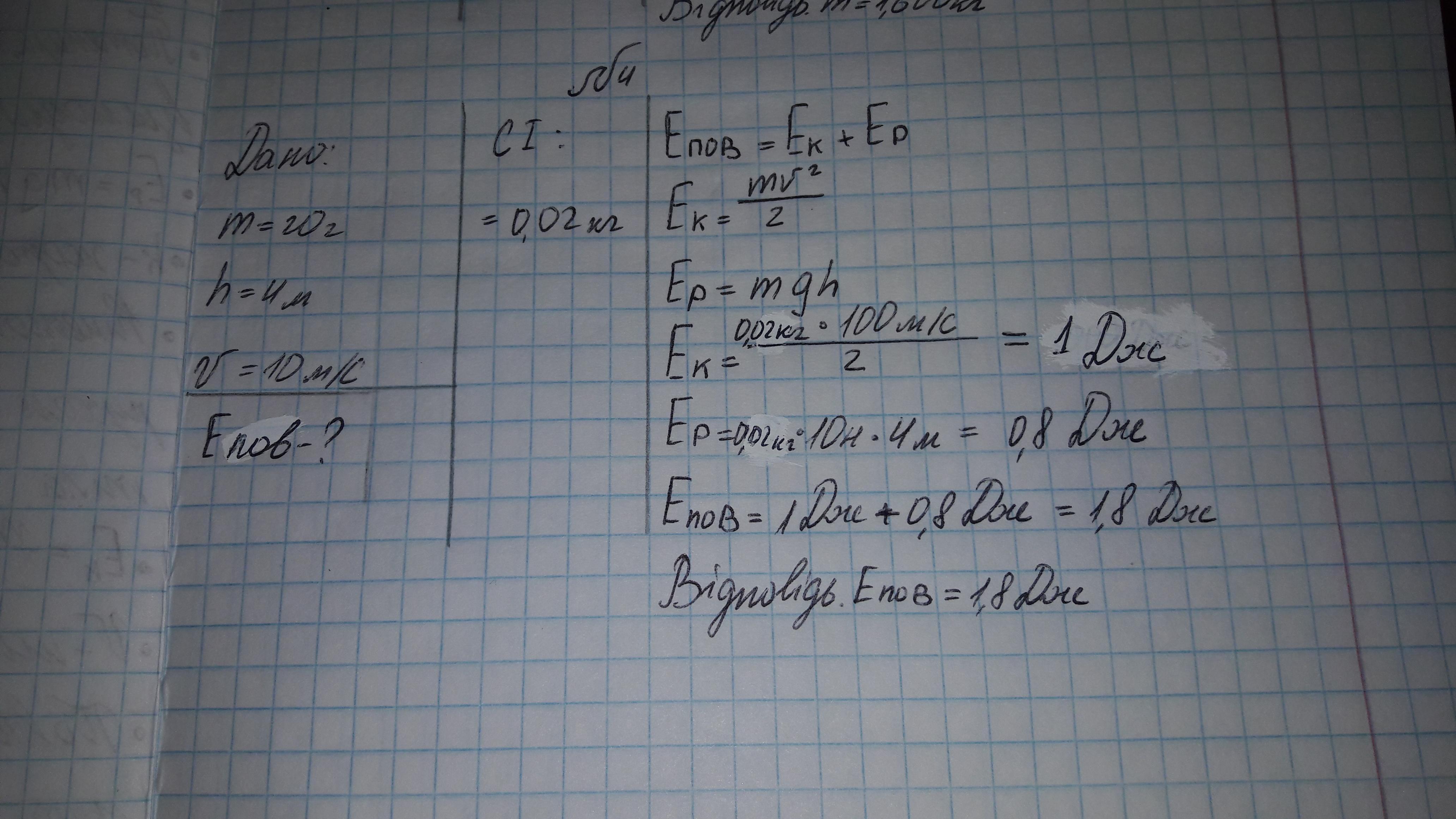 Визначити повну механічну енергію каменя масою 20 г що рухається на висоті 4 м зі швидкістю 10 м секунду, срочно!!!!