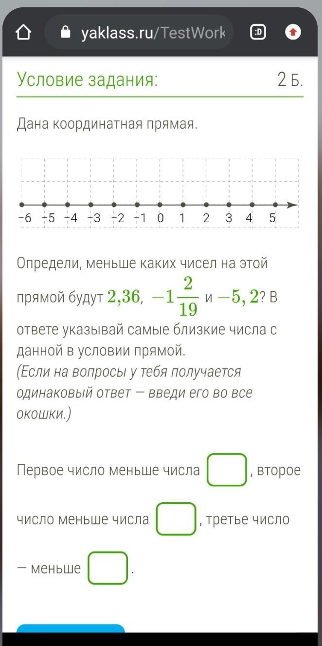 Определи, меньше каких чисел на этой прямой будут 2,36, −1219 и −5,2? В ответе указывай самые близкие числа с данной в условии прямой.