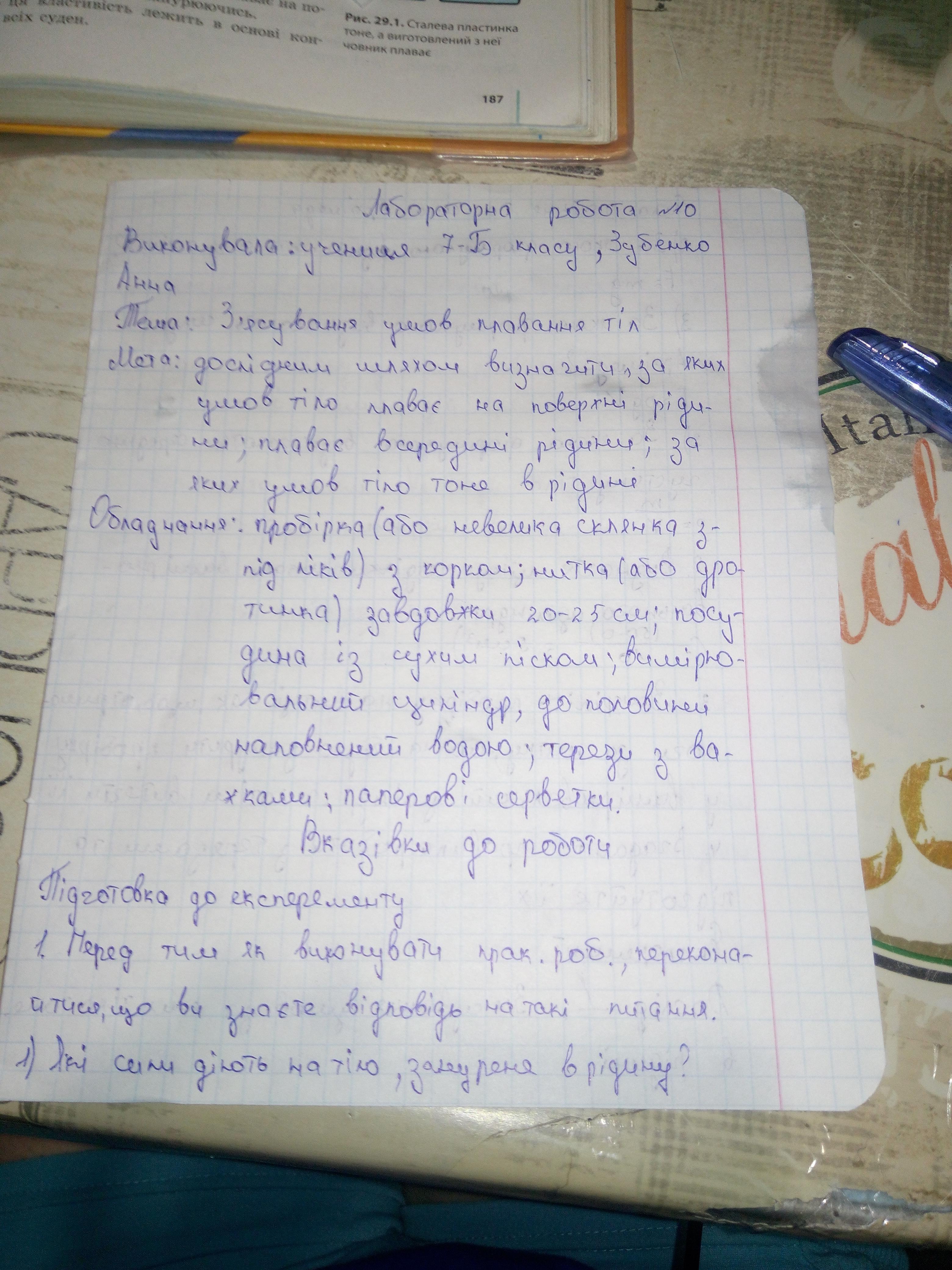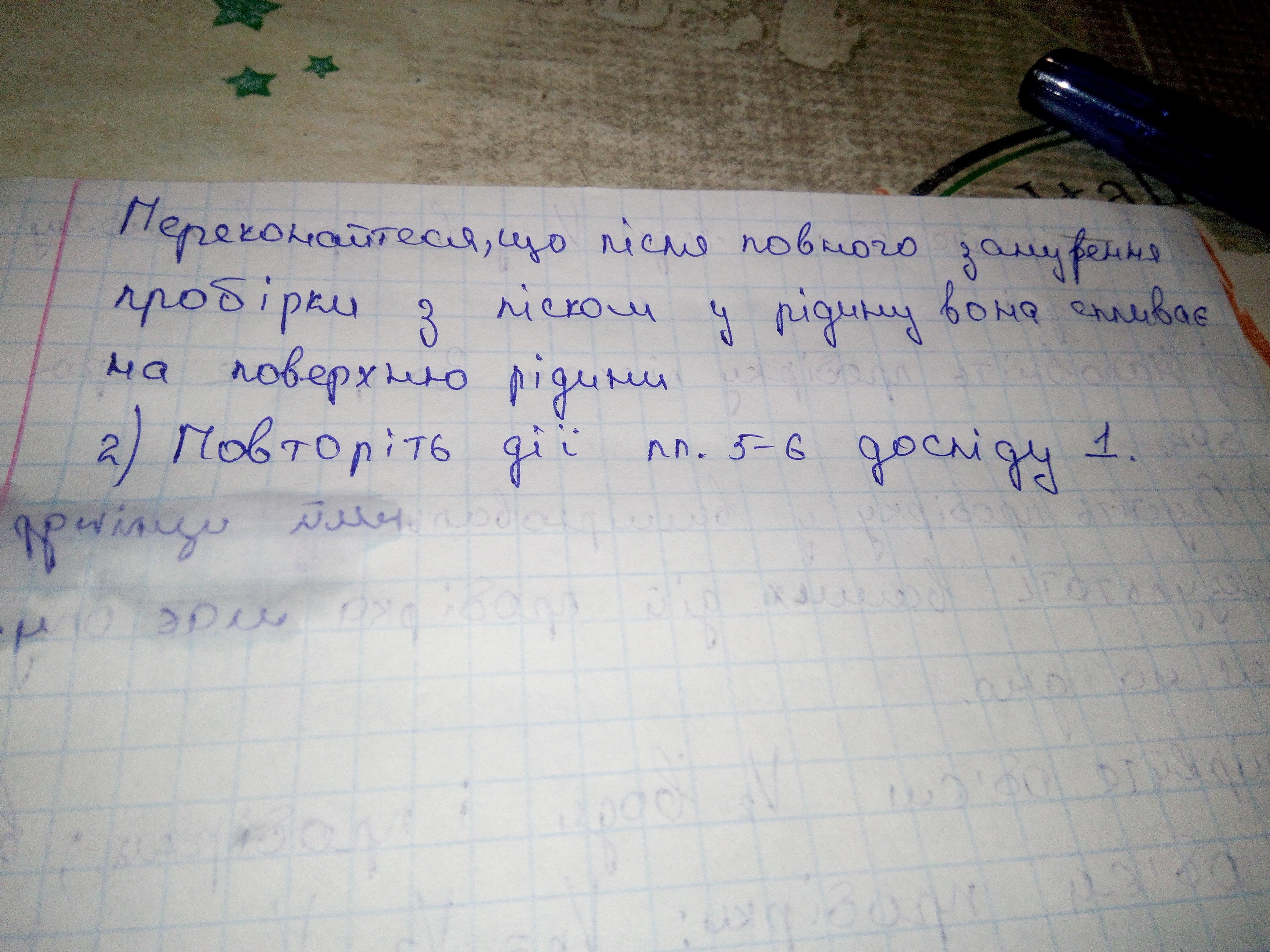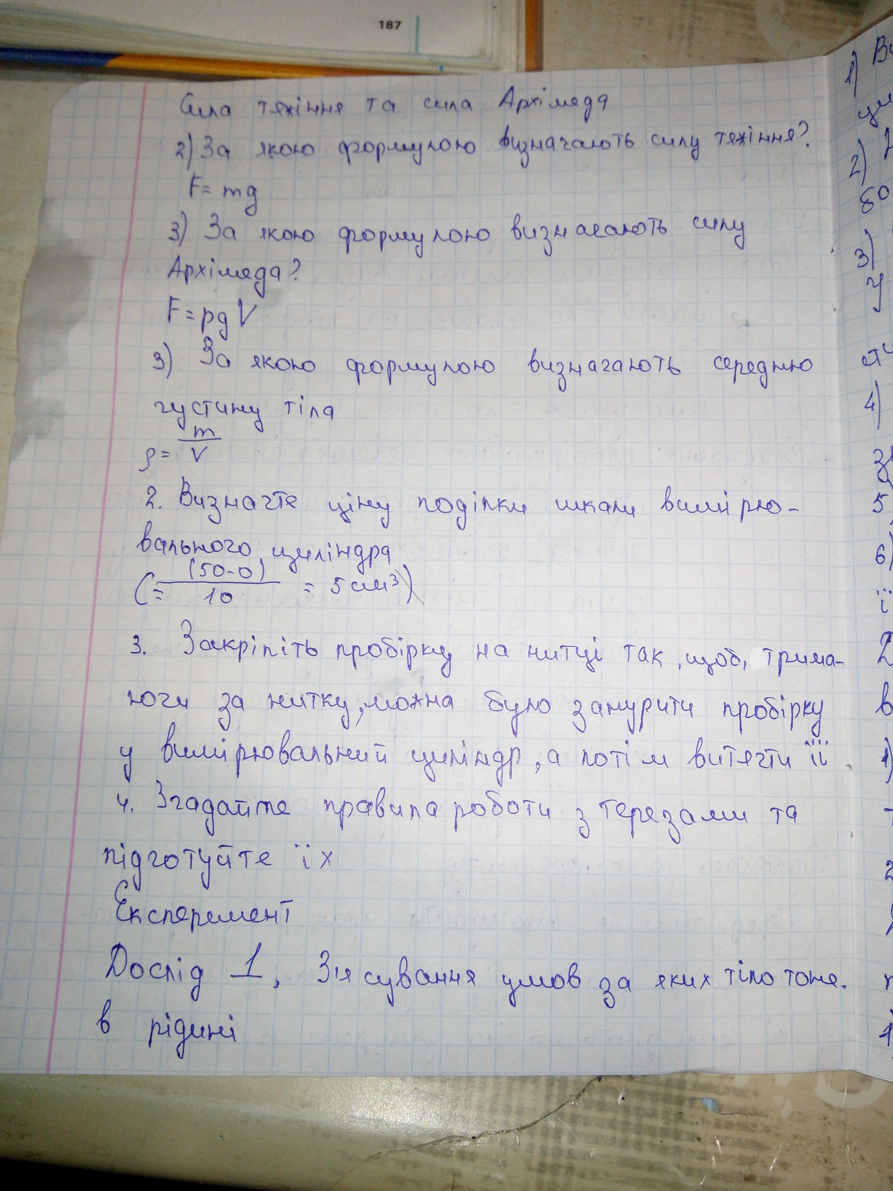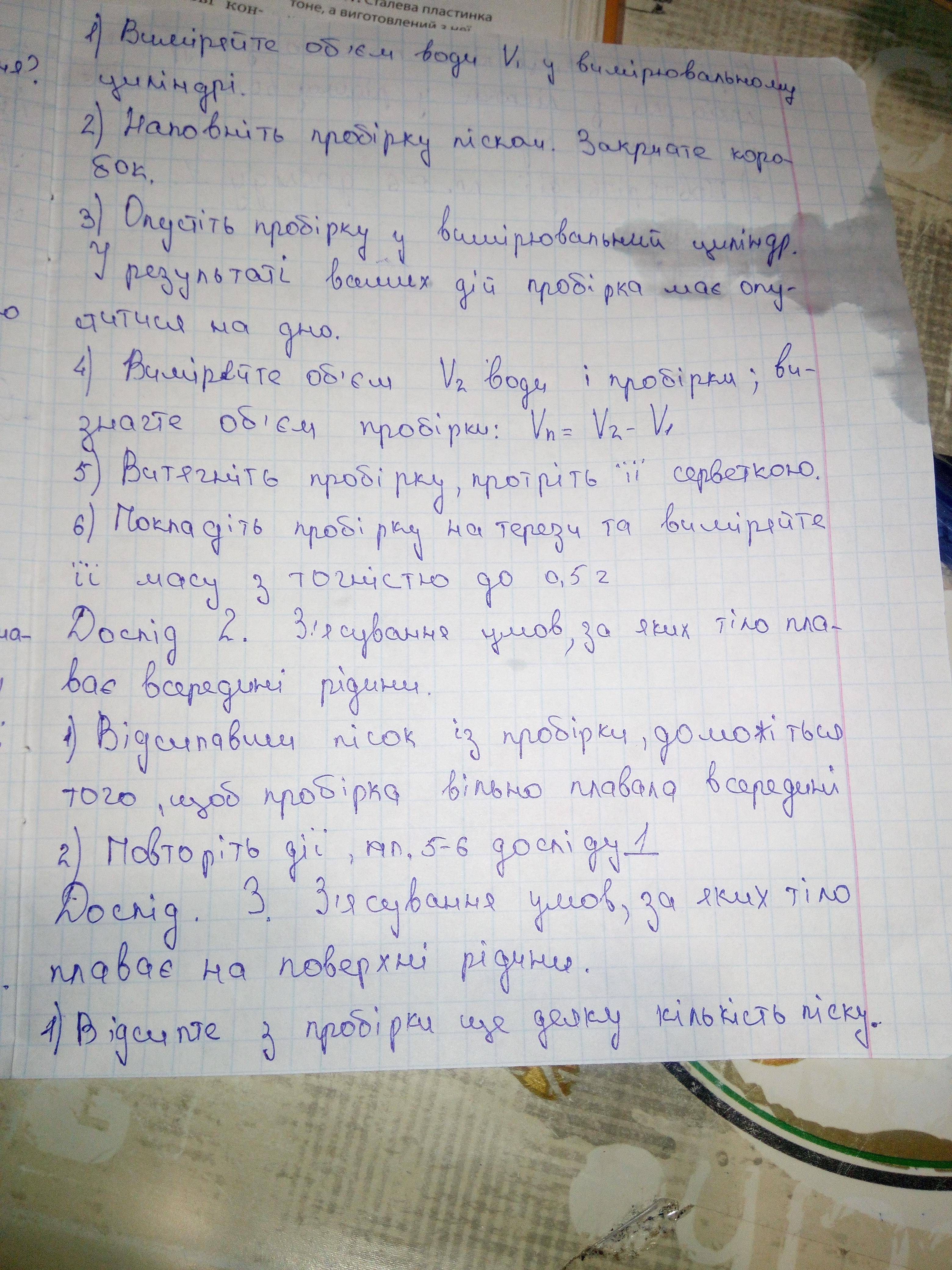 Обладнання - пробірка (або невелика склянка з-під ліків) з корком, нитка завдовжки 20 - 25 см, посудина із сухим піском, вимірювальний циліндр, до половини наповнений водою, терези з важками, паперові серветки