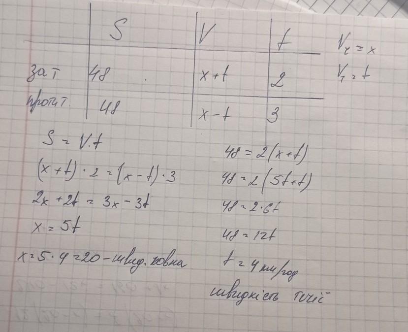 Цю відстань човен проходить за течією річки за 2 год, а проти течії — за 3 год. Знайди власну швидкість човна і швидкість течії річки.