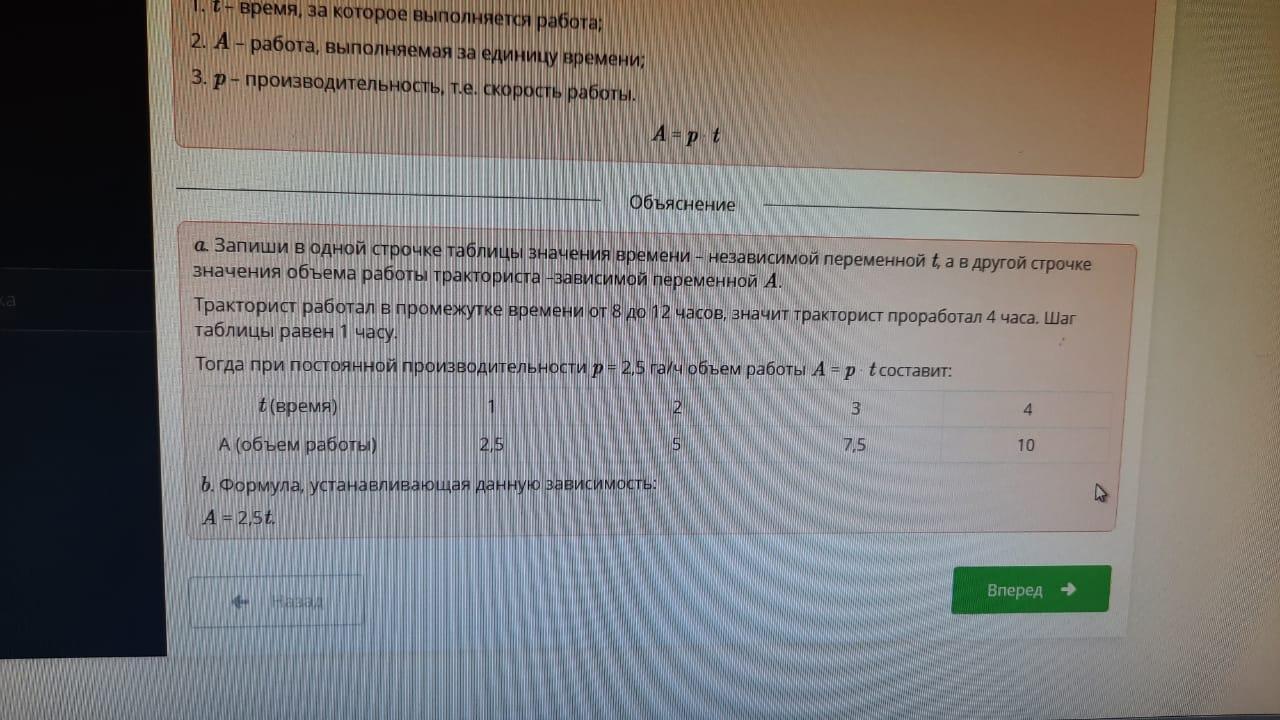 a. Составь таблицу зависимости объема работы тракториста A от времени работы t при постоянной производительности p.