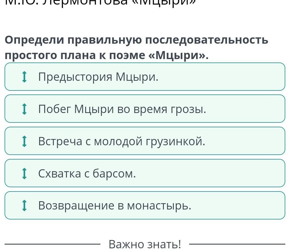 Определи правильную последовательность простого плана к поэме «Мцыри».