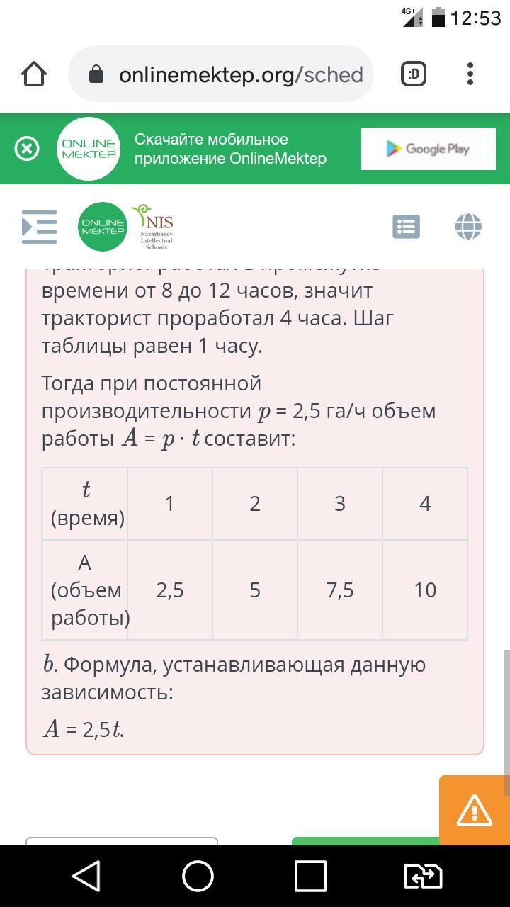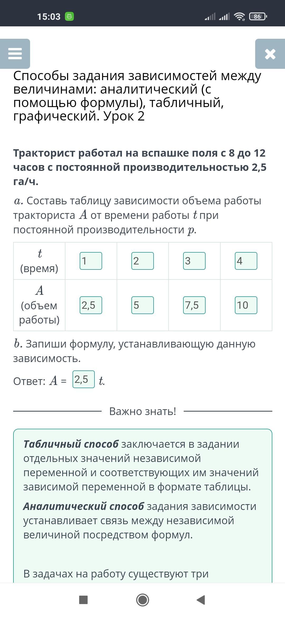 Способы задания зависимостей между величинами: аналитический (с помощью формулы), табличный, графический. Урок 2 Тракторист работал на вспашке поля с 8 до 12 часов с постоянной производительностью 2,5 га/ч. a. Составь таблицу зависимости объема работы тракториста A от времени работы t при постоянной производительности p. t (время) A (объем работы) b. Запиши формулу, устанавливающую данную зависимость. Ответ: A = t.