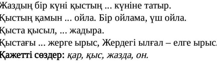 Көп нүктенің орнына қажетті сөздерді қойып, мақал-мәтелдерді көшіріп жазыңдар/поставив вместо многоточия нужные слова, списать пословицы-поговорки