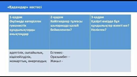 « Қадамдар » кестесі 1 - қадам Әңгімеде көтерілген гуманистік құндылықтарды анықтаңдар 2 - қадам Кейіпкерлер тұлғасы шығармада қалай бейнеленген ? 3 - қадам Қазіргі өмірде бұл құндылықтар өзекті ме ? | Неліктен ? әдептілік , сыпайылық , Естемес кішіпейілділік , Оразымбет - жомарттық , өнерпаздық Жаныл -з