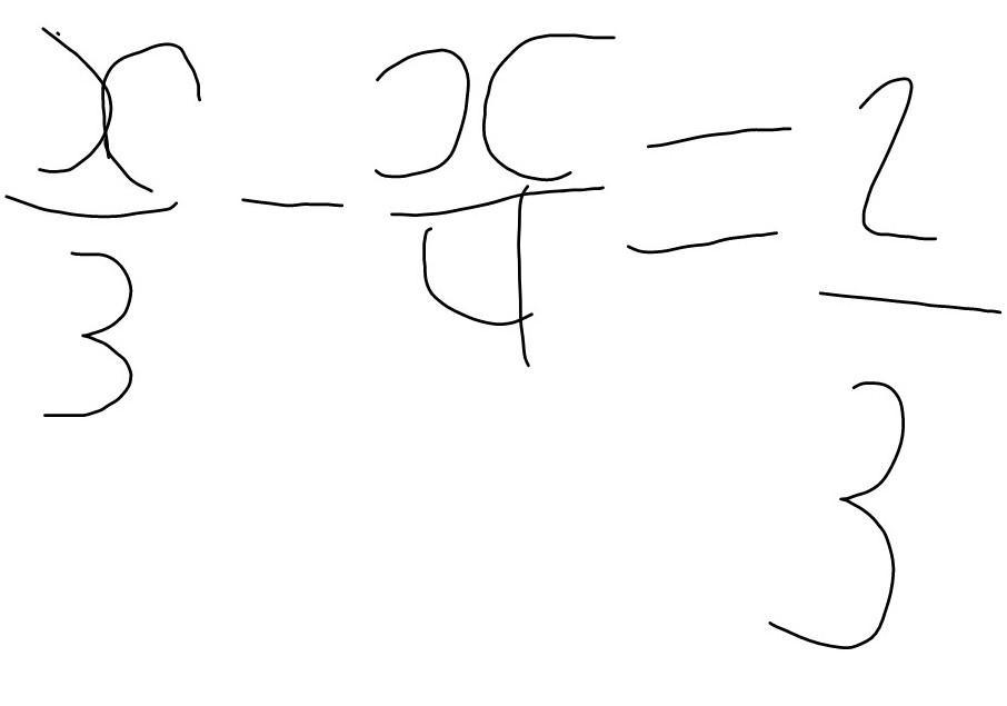 \frac{x}{3} - \frac{x}{4} =\frac{2}{3} \\\frac{x}{12} =\frac{2}{3} \\3x=24\\x=24:3\\x=8