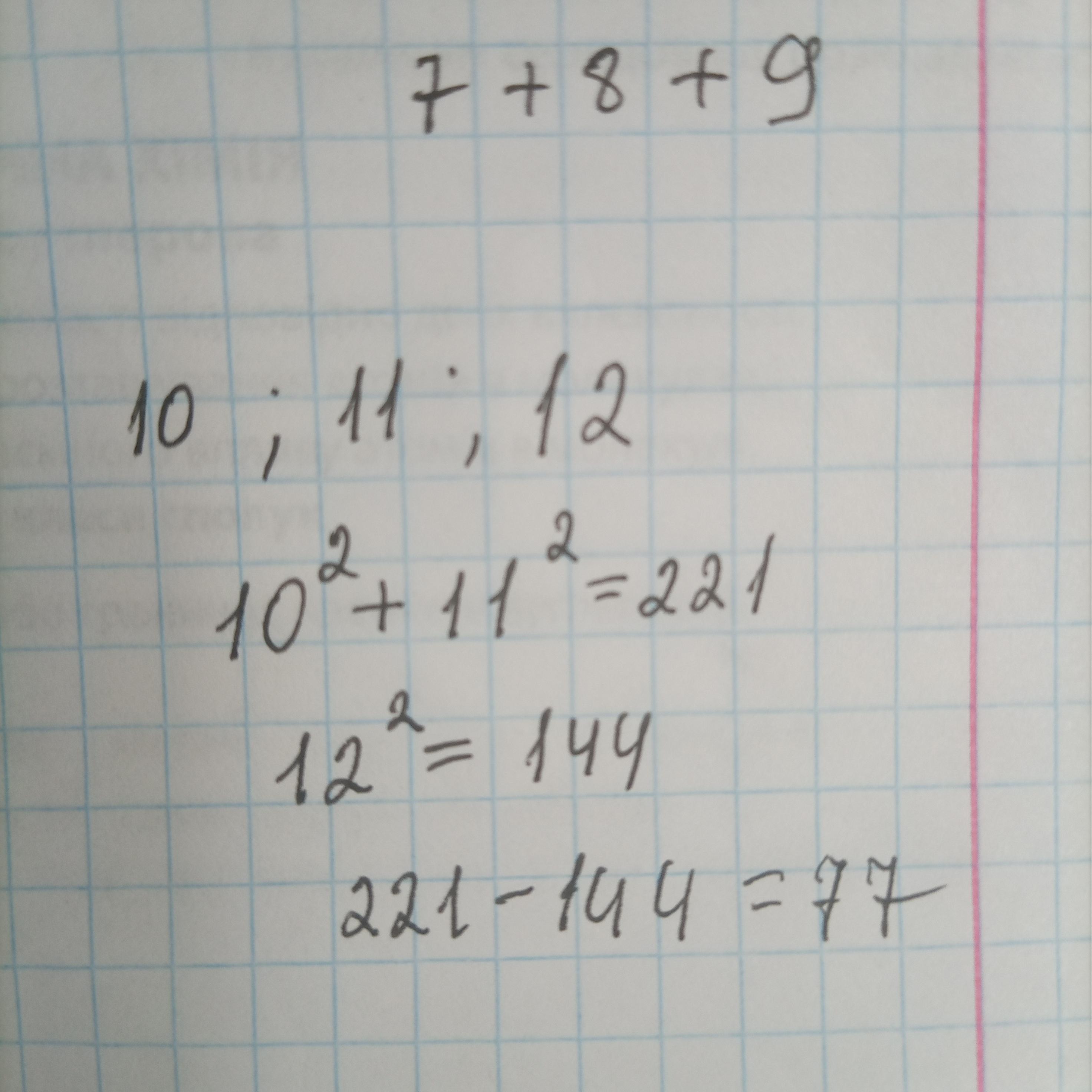 Знайти три послідовних цілих числа, якщо сума квадратів перших з них на 77 більша від квадрата третього числа.