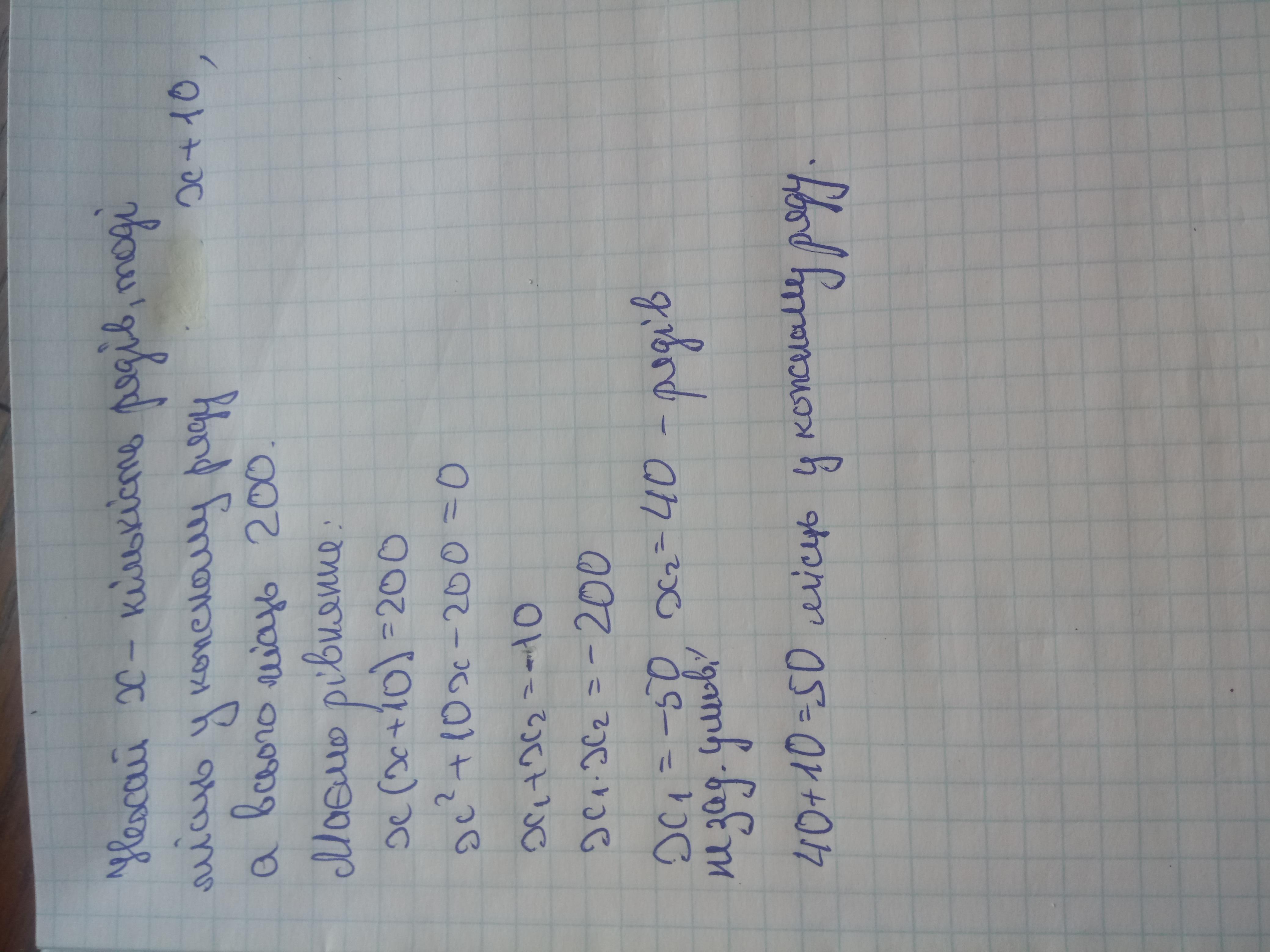 Задача. В театрі розрахованому на 200 місць з однаковими рядами та з однаковою кількістю місць в кожному ряду, рядів виявилося на 10 менше, ніж місць в кожному ряду. Скільки в кожному ряду місць та скільки рядів в театрі?