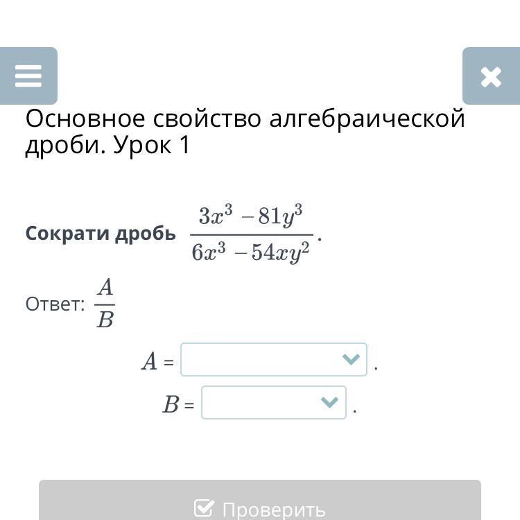 Разложим содержимое скобок в числителе по формуле разности кубов, а в знаменателе — по формуле разности квадратов: