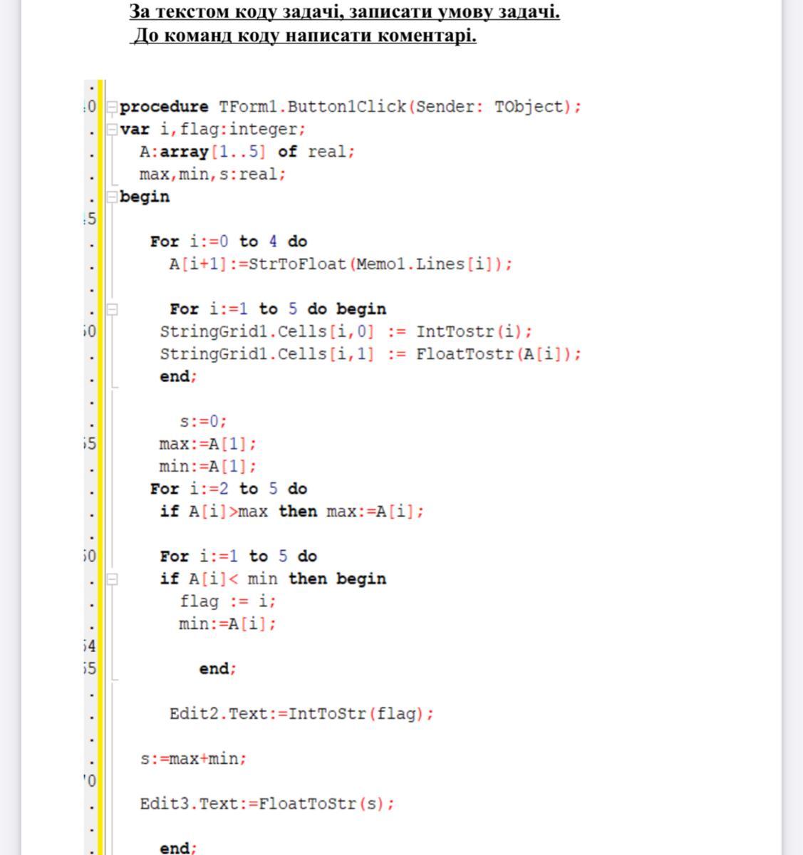 За текстом коду задачі, записати умову задачі. До команд коду написати коментарі.
