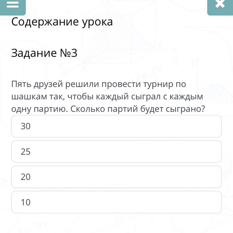 Пять друзей решили провести турнир по шашкам так, чтобы каждый сыграл с каждым одну партию. Сколько партий будет сыграно?