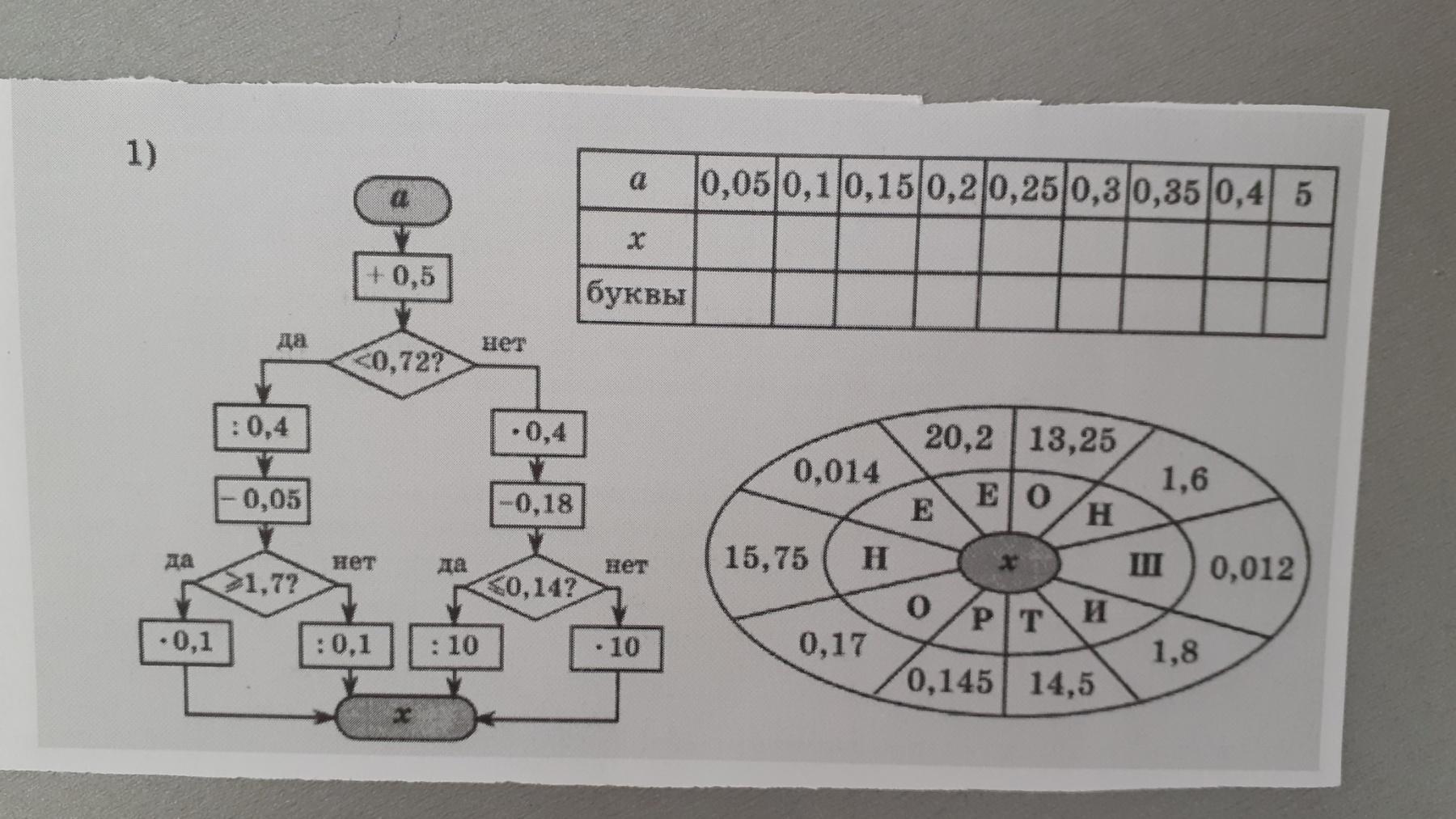 Смотрим на круг с буквами и видим что 13,25 это буква О. Заносим данные в таблицу. В столбик а=0,05; х=13,25; буквы=О.