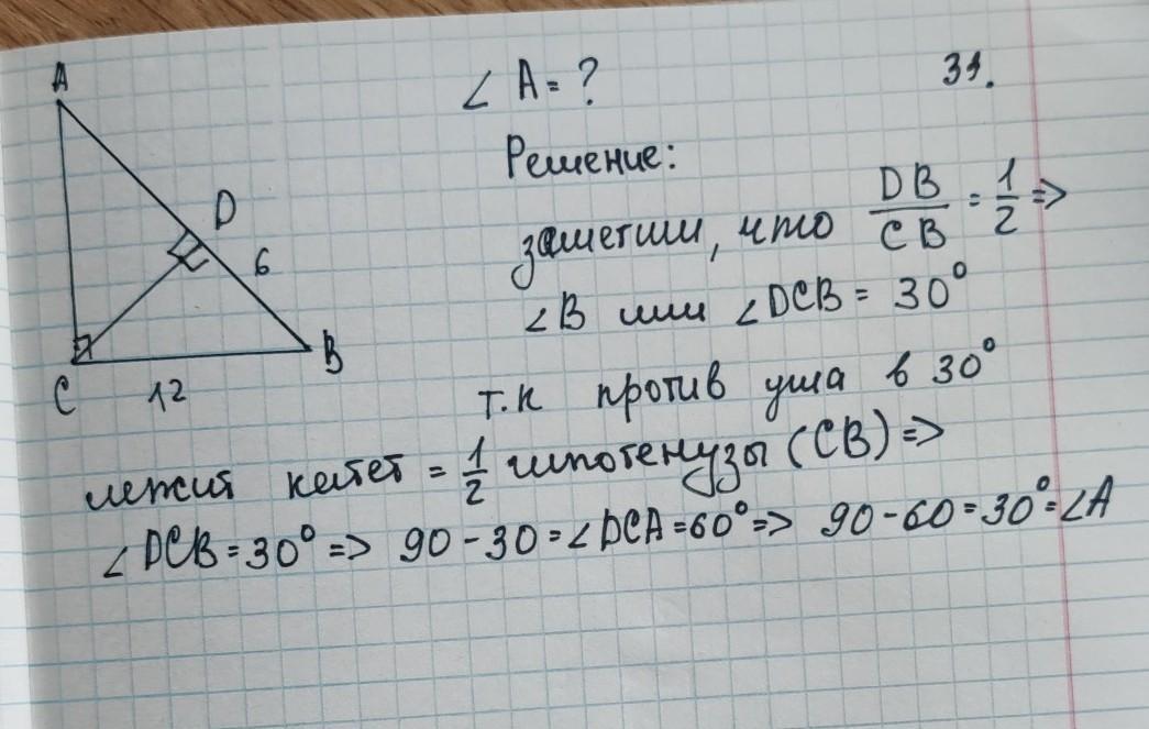 Сторона AB треугольника ABC продолжена за точку B. На продолжении отмечена точка D так, что BC=BD. Найдите величину угла, BCD если угол ACB равен 35°, а угол BAC равен 65°. 33. В прямоугольном треугольнике ABC с прямым углом C проведена высота CD. Найдите величину угла A, если DB = 6, а BC =12.