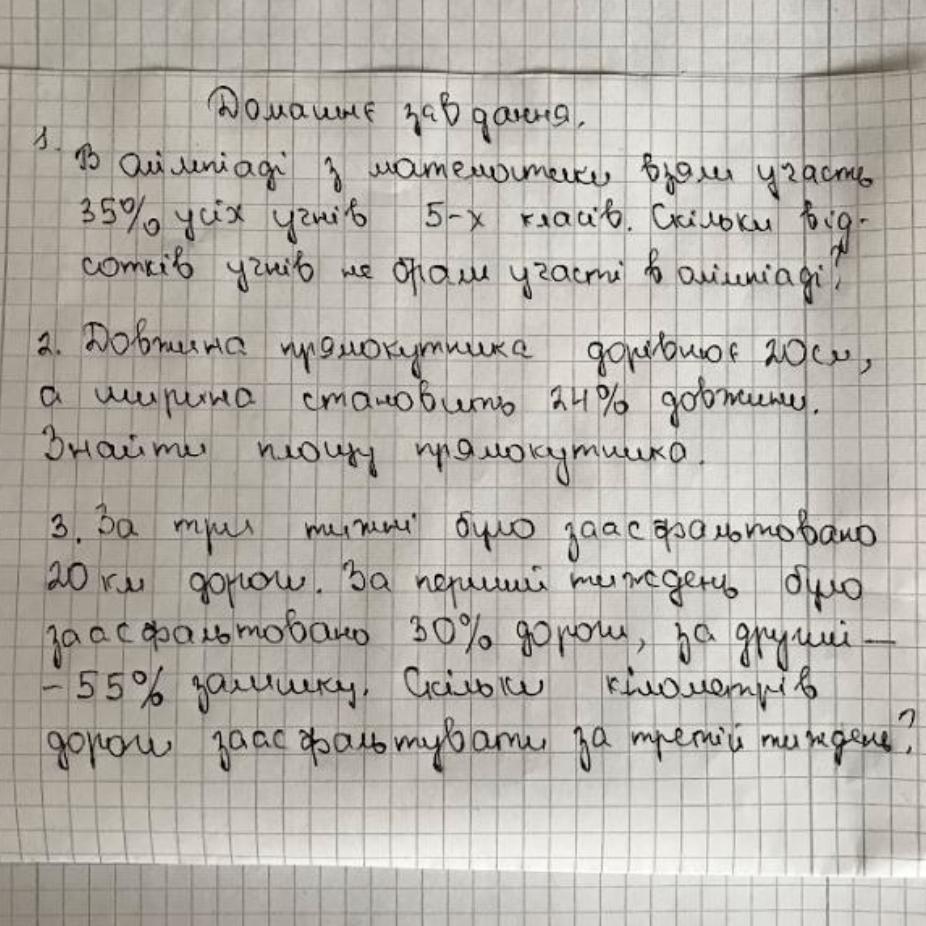 3. За три тижні було засфальтовано 20км дороги. За перший тиждень було засфальтовано 30% дороги,за другий 55% залишку. Скільки кілограмів дороги засфальтувати за третій тиждень?