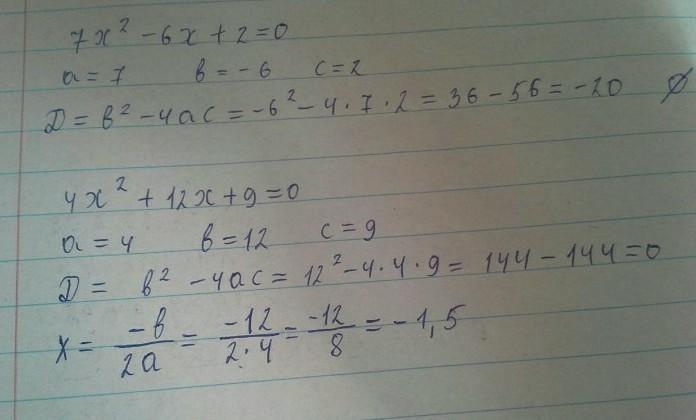 D = b² - 4ac = (-6)² - 4•7•2 = 36-56 = - 20