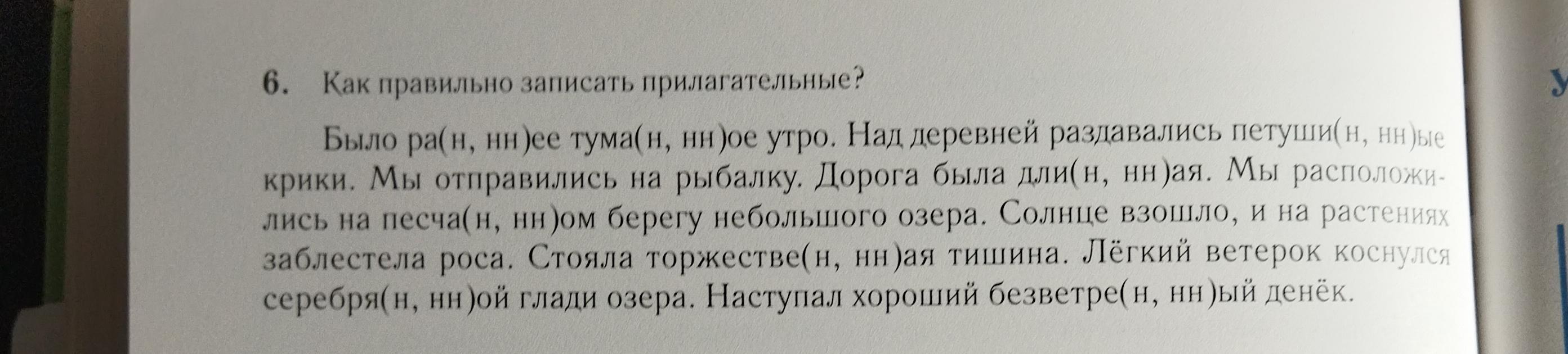 Было раннее туманное утро. Над деревней раздавались петушиные крики.Мы отправились на рыбалку. Дорога была длинная.Мы расположились на песчаном берегу небольшого озера. Солнце взошло, и на растениях заблестела роса. Стояла торжественная тишина.Лёгкий ветерок коснулся серебряной глади озера. Наступал хороший безветренный денёк.