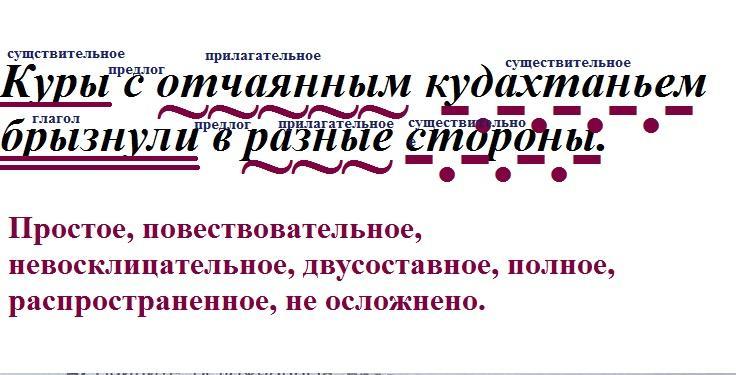 куры(подлежащее) с(предлог) отчаянным(определение) кудахтаньем(дополнение) брызнули(сказуемое) в(предлог) разные(определение) стороны(дополнение) (Повест., Невоскл., простое, бессоюзное)