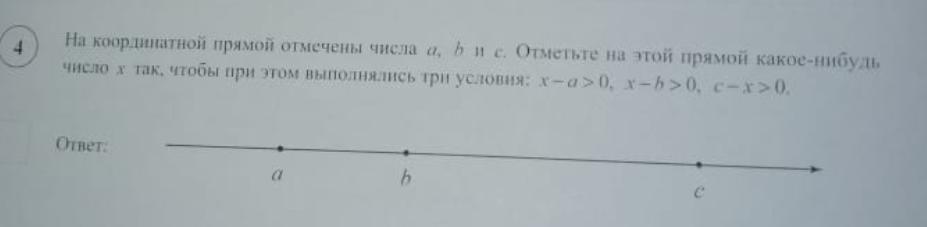 На координатной прямой отмечены числа a,b и c. Отметьте на этой прямой какое-нибудь число x так, чтобы при этом выполнялись три условия: x-a>0, x-b>0, c-x>0