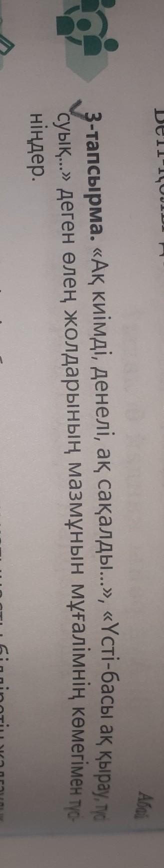 3тапсырма "Ақ,киімді,денелі,ақ сақалды...","Үсті-басы ақ қыру,түсі суық..."деген өлең жолдарының мазмұнын мұғалімнің көмегімен түсініңдер.