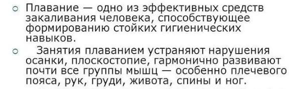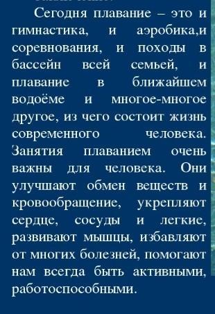 Ответ:Плавание ето вид спорту Когда ты розминаншь свои ноги и руки но большу нагрузку даёшь конечно на ноги.Бывают такое соревнования кто быстрее и хорошо будет плести.