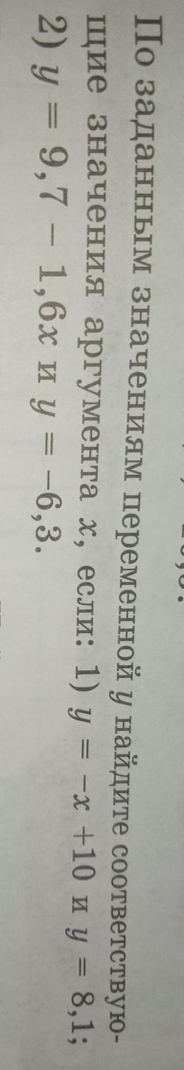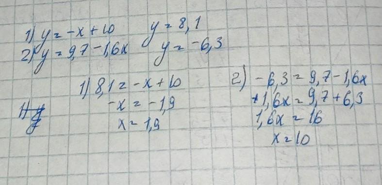 По заданным значениям переменной у найдите соответствующие значения аргумента х, если: 1) у = -х + 10 у = 8,1; 2) у = 9,7 - 1,6х и у = -6,3.