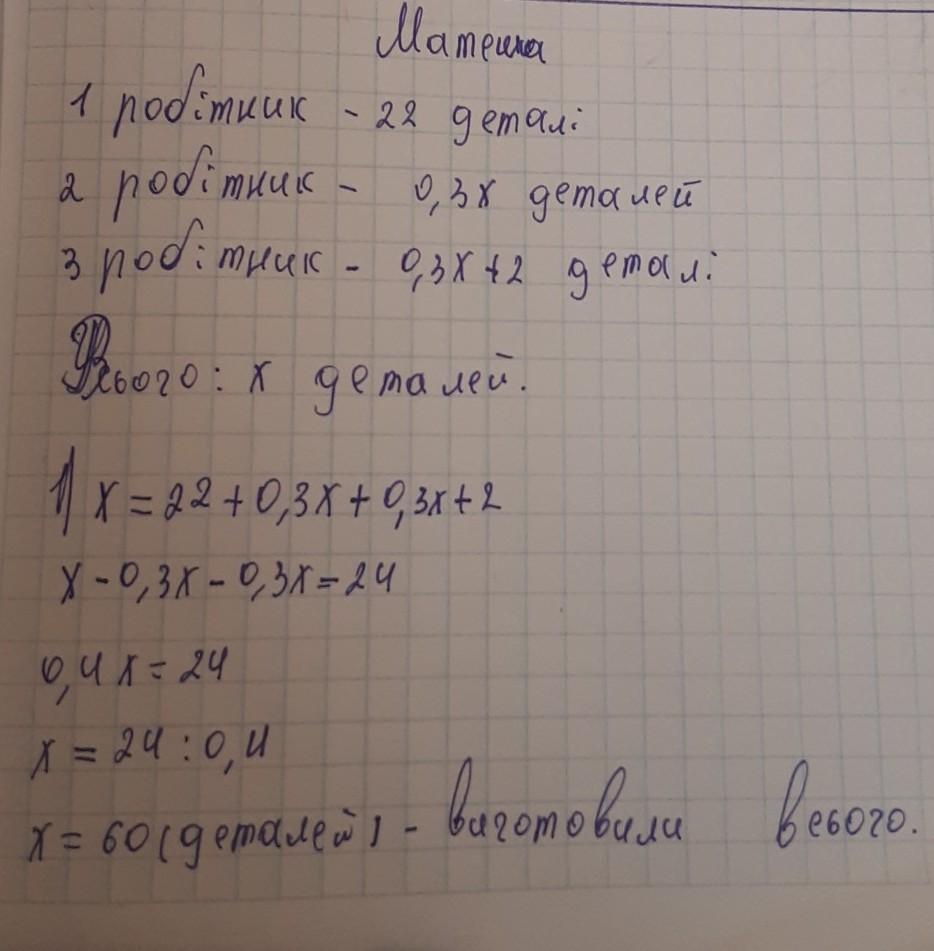 За зміну 3 робітники виготовили партію деталей. Перший робітник виготовив 22 деталі, другий — 30% усіх деталей, а третій — на 2 деталі більше, ніж другий. Скільки всього деталей виготовили робітники?