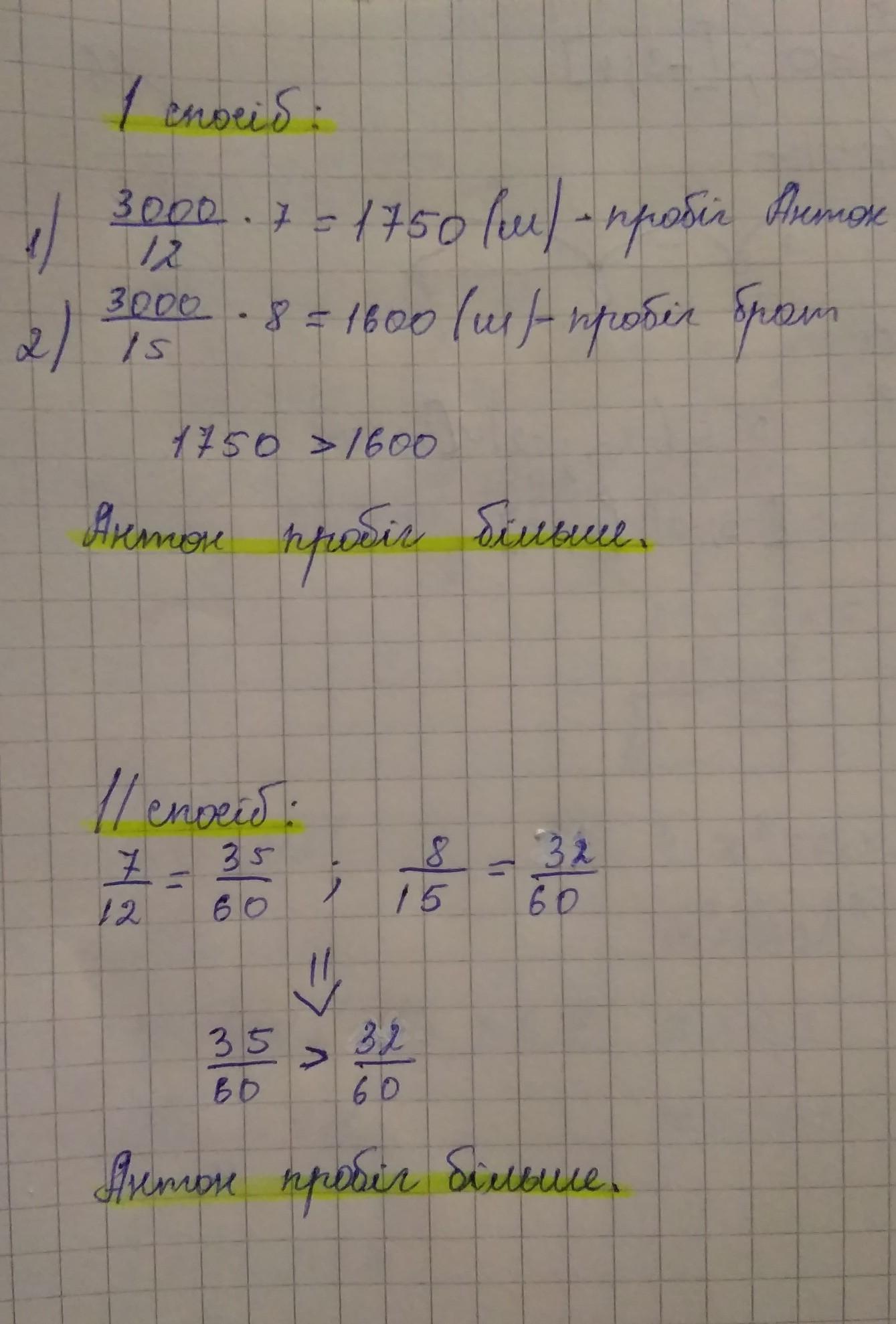 Антон с братом решили сделать пробежку на дистанцию 3 км Антон остановился передохнуть когда пробежал 7/12 этой дистанции, а его брат когда пробежал 8/15 кто из мальчиков пробежал до остановки больше расстояния?Решить двумя способами.