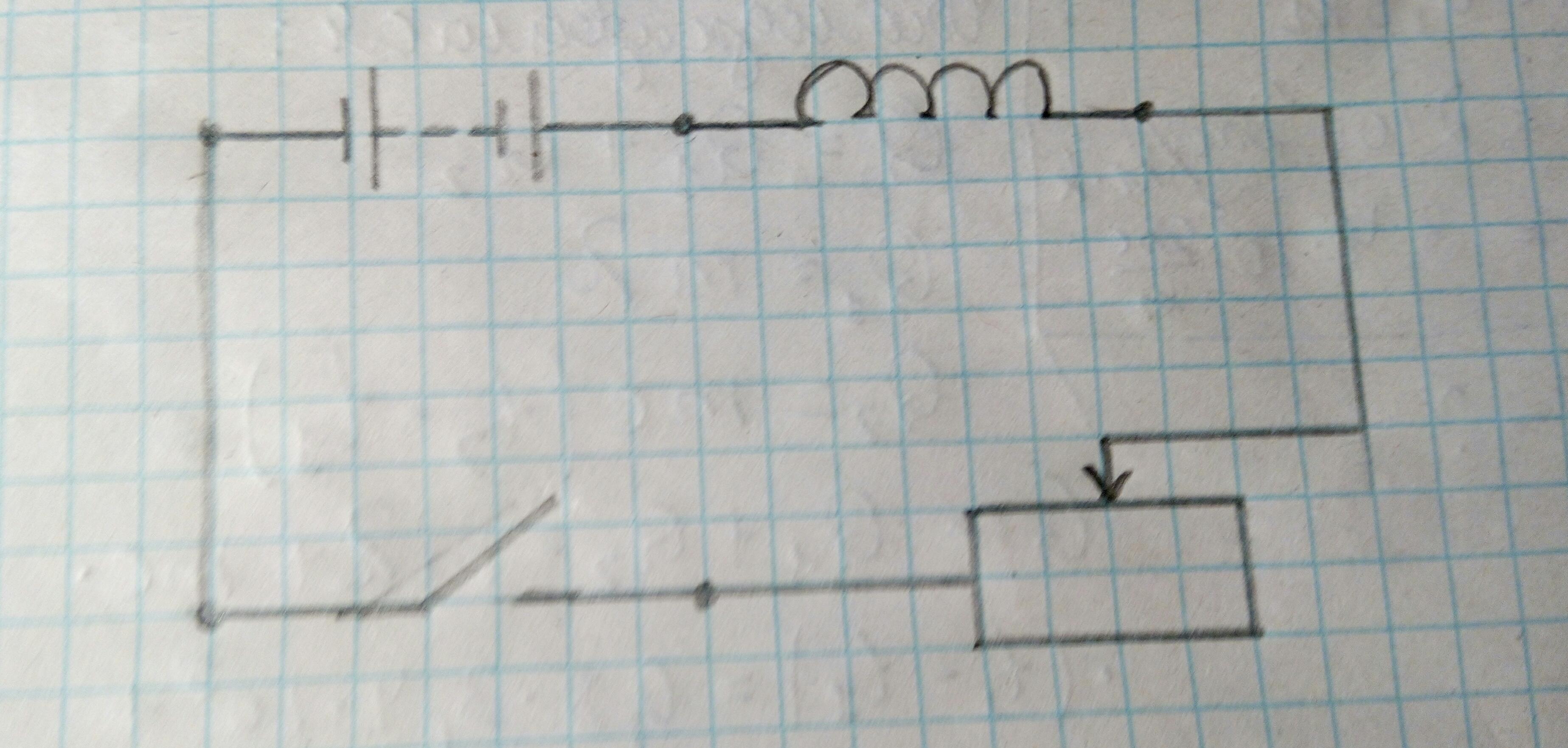 С лева на право: Источник питания, катушка индуктивности, реостат и ключ.